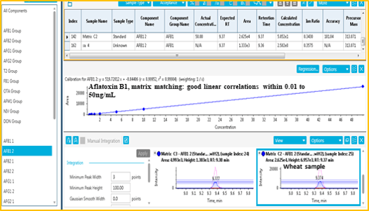 When data of actual samples were analyzed, as shown in Figure 8, they were processed quickly and easily, and the interface was intuitive. The result showed a standard curve, a sample and matrix spiked ion abundance ratio, accuracy, sample concentration, and retention time. One can intuitively determine that wheat produced in a certain area contains aflatoxin B1 (AFB1) based on a sample ion abundance ratio of 0.357, a matrix spiked ion abundance ratio of 0.343, and concentration of 2.5µg/kg. This study examined 10 samples including wheat, corn, etc., from various provinces. See Table 2 for the detection results.