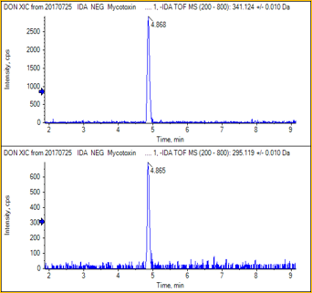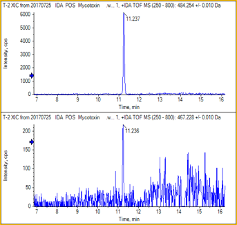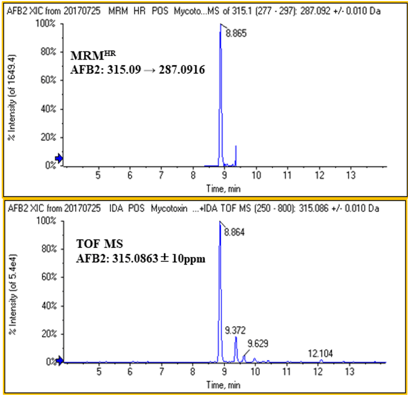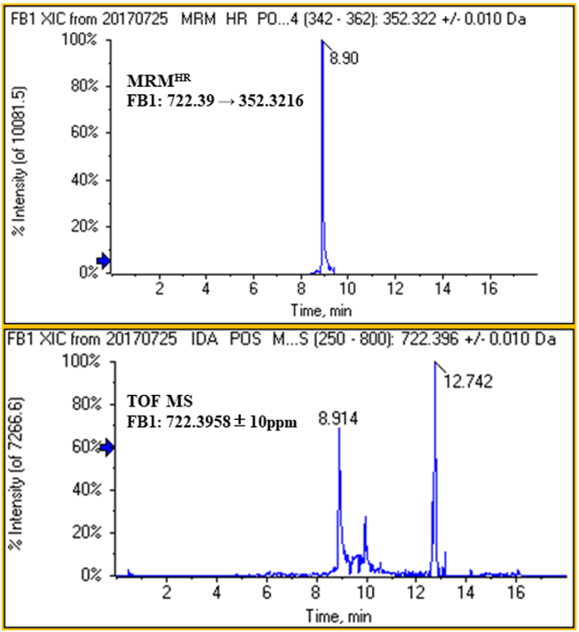 Sample preparation involved a simple liquid-liquid extraction and dilution, which does not remove much background sample matrix and can therefore leave the sample subject to interference effects. Four grain matrices were assessed for matrix effects based on the ratio of the areas of the target in the blank solvent and the matrix solvent. As the ratio approached 100%, matrix effects became insignificant; above 100% matrix effects were considered “enhancement”; below 100% there was matrix suppression. Matrix effects and presence of interferences were compared between using the TOF MS data and the MRMHR data. When TOF MS data is used for quantification of the 15 mycotoxins, matrix effects ranged between 43.1% and 125.6%, and when MRMHR workflow data was used, matrix effects ranged between 88.5% and 109.2%. The results showed that the MRMHR workflow is much more selective and resistant to matrix interference than primary TOF MS data. Figures 1 and 6 show that after the addition of corn matrix to fumonisin B1, there was strong interference with the TOF MS data, while the MRMHR data showed less noise and greater selectivity. Aflatoxin AFB1 is highly sensitive, and matrix inhibition effects are minimal when TOF MS data is used. Thus, this study shows that the MRMHR workflow is more selective and resistant to matrix inhibition, increasing method accuracy and reproducibility, which can in turn greatly decrease positive and false negative results.