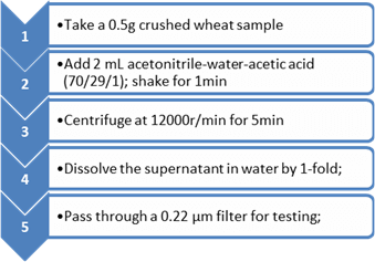 Sample preparation: This sample preparation method is simple, fast, and is suitable for wheat, corn, rice, and sesame; a total of 10 grain samples were collected from different production regions. The sample preparation workflow is described in Figure 2.