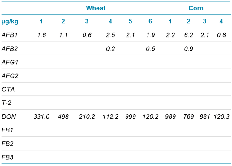 This study included a total of 10 samples of wheat and corn from different production regions. Testing showed AFB1, DON, NIV, ZEN, 3-AcDON and 15-AcDON were widely distributed throughout the wheat and corn sample, illustrating the prevalence of mycotoxin contamination of grain samples and highlighting the need for greater monitoring and oversight.