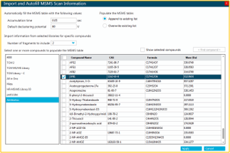 LC-MS/MS analysis: After processing, samples were injected onto an ExionLC AC system coupled to a SCIEX X500R QTOF system. Chromatographic separation was optimized to provide the best separation and ionization of the mycotoxins. Mass spectrometry analysis was performed using both positive and negative electrospray ionization. The compound information was entered using the MRMHR Method Editor by importing the method tables5 containing the precursor m/z and retention times, m/z for 5 fragment ions, as well as specific MS settings such as declustering potential (DP) and collision energy (CE). The Import and Autofill window is shown in Figure 3.