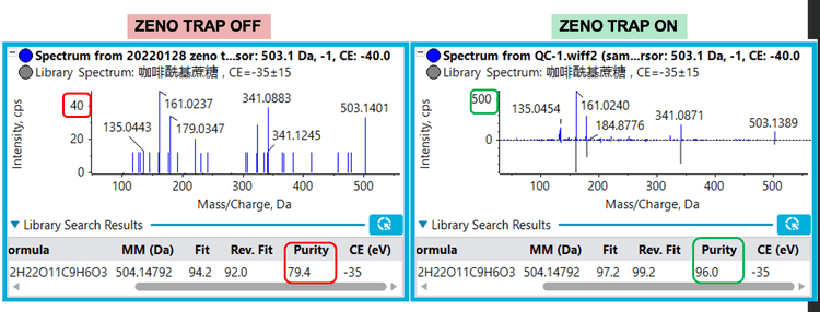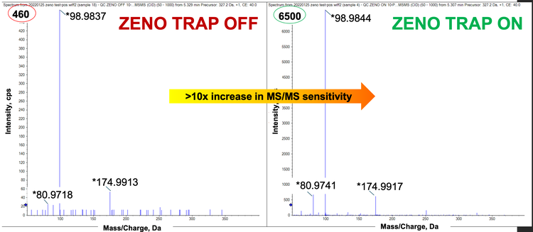 - The Zeno trap offers improvement in MS/MS sensitivity and ion duty cycle, allowing for greater efficiency and confidence in identifying low-level or even previously undetected compounds in complex matrices such as citrus pulp