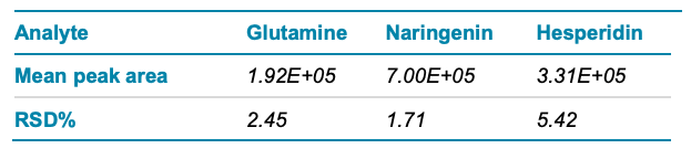 A single LC-MS/MS method capable of identifying structurally diverse components of the citrus metabolome—such as sugars, organic acids, amino acids, flavonoids, limonoids and lipids—has been established. Retrospective mining of this data may reveal novel endogenous metabolites, such as the natural sweeteners recently identified in citrus fruits using a similar metabolomicsbased screening strategy.7 This type of analysis could enable the discovery of new natural, non-caloric sugar substitutes for artificial sweeteners, which is a growing demand in the food and beverage market.