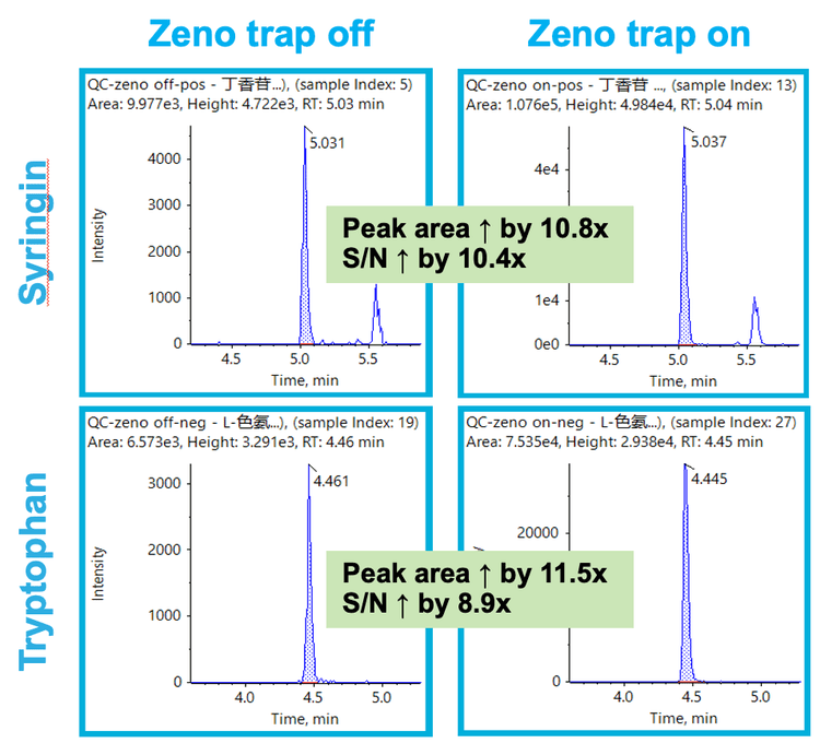 Figure 3. The intensity of the analyte peaks for syringin (positive) and tryptophan (negative) in the MRMHR XIC increased by a factor of >10 when the Zeno trap was turned on.