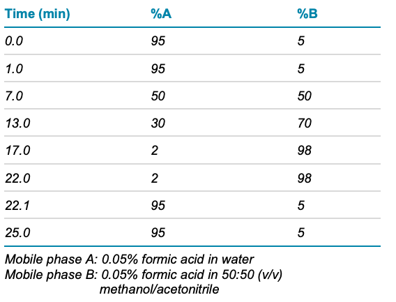 Chromatography: Reverse-phase separation was conducted with a Waters HSS T3 C18 column (100 x 3 mm, 1.7 µm). A flow rate of 0.3 mL/minute and an injection volume of 1 μL was used. The 25-minute elution gradient is shown in Table 1.