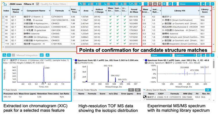 Suspect and/or nontargeted screening often yields a substantial list of candidate compounds that is both time-consuming and labor-intensive to review. SCIEX OS software allows the user to define confidence thresholds on critical confirmation criteria such as mass error, isotopic ratio matches and MS/MS library matches, which are collectively assessed to identify a compound. When combined with the enhanced filtering capability in SCIEX OS software, 142 natural components—including sugars, organic acids, lipids, flavonoids and their derivatives, amino acids and their derivatives, nucleosides and nucleotides, phenols, terpenoids, coumarin and its derivatives and vitamins— were identified from citrus pulp in a fast and simple screening workflow (Figure 4).