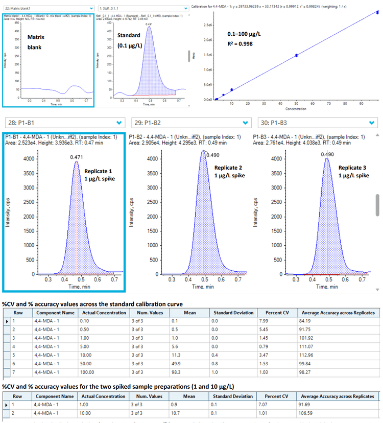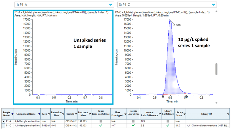 Once the initial screening was performed to assess potential hits, the extracted ion chromatograms (XICs) were reviewed to ensure that the analyte peak was detected in the spiked sample (10 µg/L) but not in the solvent blank or unspiked sample. Figure 3 shows example XICs for an analyte identified in SCIEX OS software.
