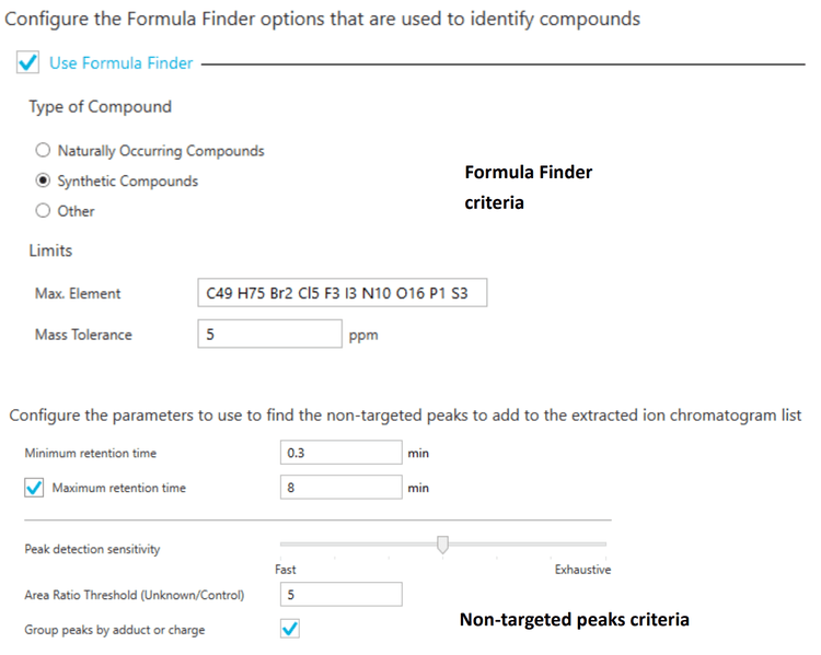 To perform unknown screening, the same dataset acquired for the suspect screening was used. The data was processed using the unknown screening workflow in SCIEX OS software to identify the unknown features. Initially, the same mass spectral libraries were used to assess the putative matches outside of the suspect list. Of the 44 compounds identified in the positive ion acquisition mode, 17 were unique compounds that were not detected using the suspect screening. In addition, both the Formula Finder and non-targeted peaks features in SCIEX OS software were utilized. Figure 4 shows how to implement these tools in the processing method. A control (extraction solvent) was also used to compare against the sample. This comparison helped reduce false positives by only including sample peaks that were sufficiently larger than blank peaks, based on a user-specified area ratio threshold.