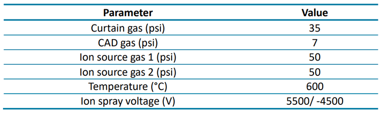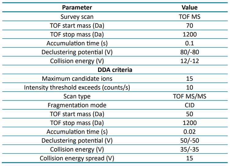Mass spectrometry: Data was acquired using the ZenoTOF 7600 system, operated in both positive and negative ionization modes using electrospray ionization (ESI). MRMHR and data-dependent acquisition (DDA) with the Zeno trap enabled (Zeno DDA) were used. Tables 2, 3 and 4 define the source and MS parameters used for both methods.
