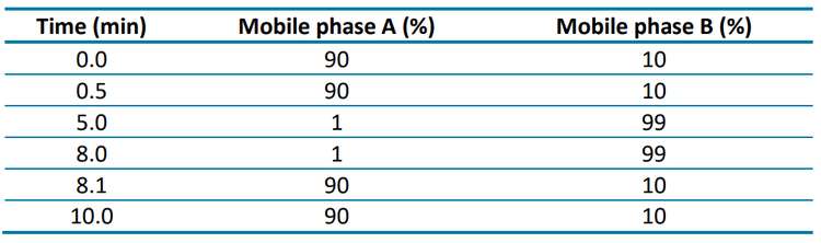 Chromatography: The ExionLC AD system was used for separation with a Phenomenex Kinetex™ EVO C18 column (1.7 µm, 100 x 2.1 mm). Mobile phase A was water with 0.1% formic acid and mobile phase B was methanol with 0.1% formic acid. The injection volume was 2 µL, the column oven was set to 40°C and the flow rate was 0.4 mL/min. Additional gradient conditions are listed in Table 1.