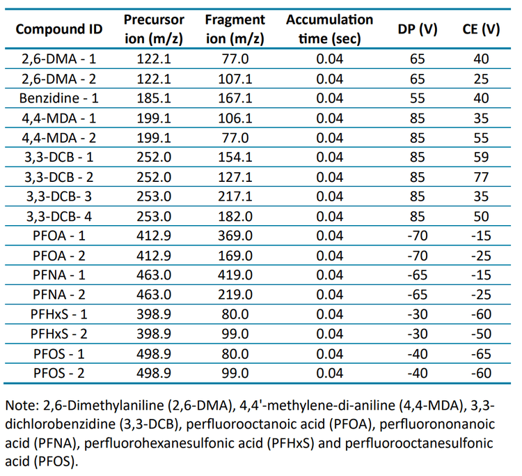 Finally, the components of interest or at risk of being harmful were quantified. Quantitation was performed using DDA (MS1 only), however, the maximum sensitivity and specificity were achieved using MRMHR acquisition. MRMHR uses the optimized transitions and compound-specific parameters of collision energy (CE) and declustering potential (DP). The transitions established by TÜV Rheinland in a previous triple quadrupole instrument method were used and the compound-specific CE and DP parameters were optimized for the ZenoTOF 7600 system.