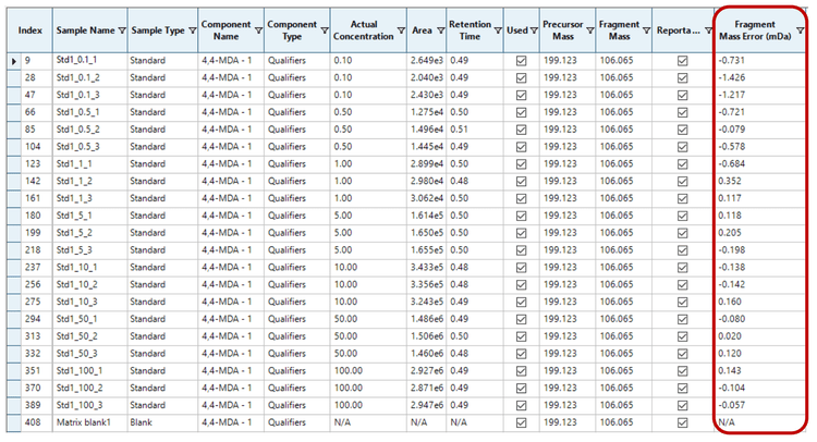 A small subset of relevant compounds was analyzed using MRMHR and limits of quantitation (LOQ) as low as 0.1 µg/L in solvent and a linear range between 0.1 and 100 µg/L were achieved. Therefore, the MRMHR workflow, in combination with the non-targeted acquisition workflows, demonstrated the flexibility of the ZenoTOF 7600 system for both screening and low-level quantitation of E&L compounds. Figure 6 shows the calibration curve, precision, % accuracy and sample results for a representative compound. Figure 7 shows the low fragment mass error (mDa) observed for 4,4’-MDA across the calibration curve analyzed.