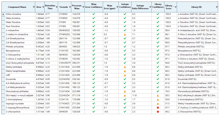 Figure 2 shows the results table generated in SCIEX OS software for sample series 1 spiked at 10 µg/L, highlighting the top hits achieved from the combined MS/MS libraries. This results table demonstrates the ease of data review possible with SCIEX OS software, as 3 levels of confidence were used to determine a significant result (mass error confidence, isotope confidence and library hit confidence). Each parameter has a user-defined set of tolerances within the software to provide a visual cue that indicates whether the criteria were met: a green tick for acceptable, orange triangle for marginal and a red circle for unacceptable.