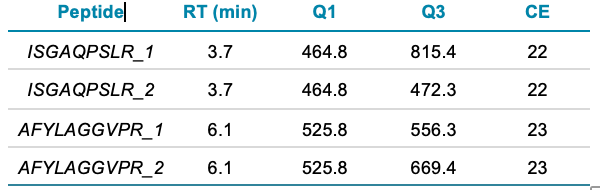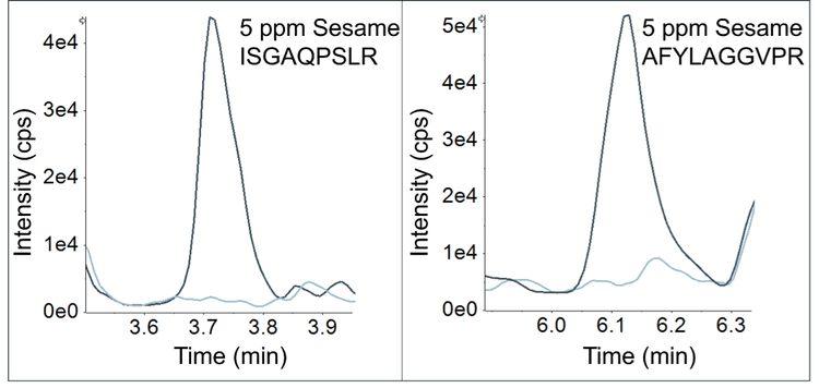 The SCIEX vMethod application for food allergen testing previously provided a workflow for sample preparation and LC-MS/MS detection of 12 distinct allergens, including egg, milk, almond, Brazil nut, cashew, hazelnut, pine nut, pistachio, pecan, walnut, peanut and soy2,3. After evaluating 24 different sesame peptides4, 2 of the most sensitive peptides were selected (Figure 1) and added to the SCIEX vMethod (Table 1).