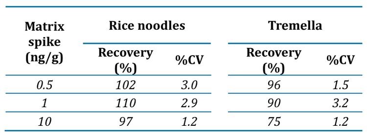 - Good recovery and precision in rice noodle and Tremella mushroom samples with mean recoveries between 75- 110% and %CVs between 1.2-3.2%