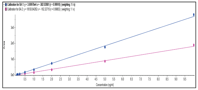 - Calibration curve performance: The correlation coefficients for quantifier and qualifier transitions were greater than 0.998 over the range of 0.05 ng/mL to 10 ng/mL in solution