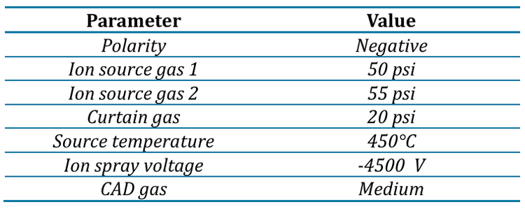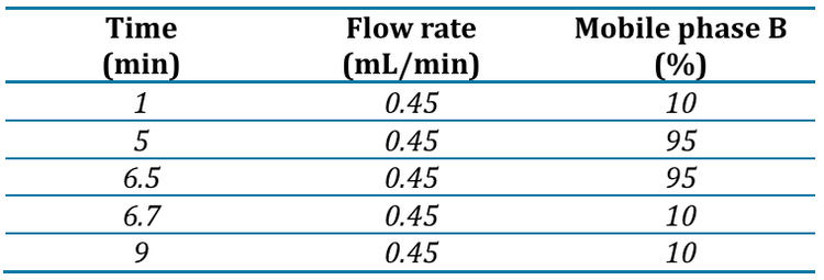 LC conditions. A SCIEX ExionLC system was used with the Phenomenex Synergi™ 4 μm Fusion-RP column (50 x 2 mm, P/N 00B-4424-B0) for chromatographic separation. Gradient conditions are described in Table 1. Mobile phase A was water with 0.01% formic acid and mobile phase B was acetonitrile. The flow was 0.45 mL/min, the injection volume was 6 µL and the column oven temperature was set to 40°C.