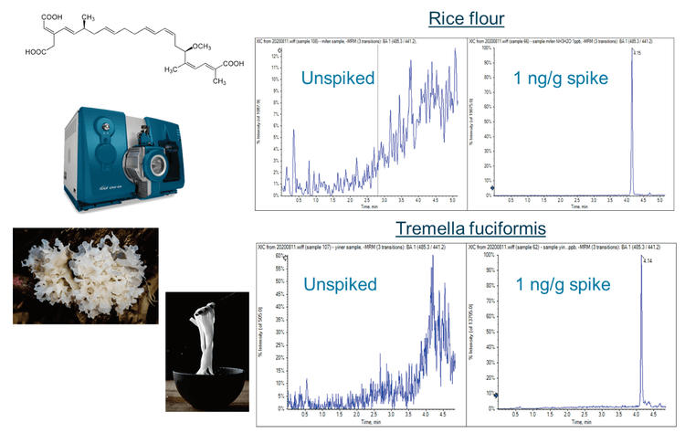 Matrix spikes were performed in the rice flour and Tremella fuciformis samples at 0.5 ng/g, 1 ng/g and 10 ng/g (n=6). Spikes were performed prior to extraction and Table 4 shows the recovery and %CV for the two matrices. Overall, the mean recovery ranged from 75% to 110% with the precision ranging from 1.2%CV to 3.2%CV. The XICs for the 1 ng/g rice flour and Tremella matrix spikes are shown in Figure 1.