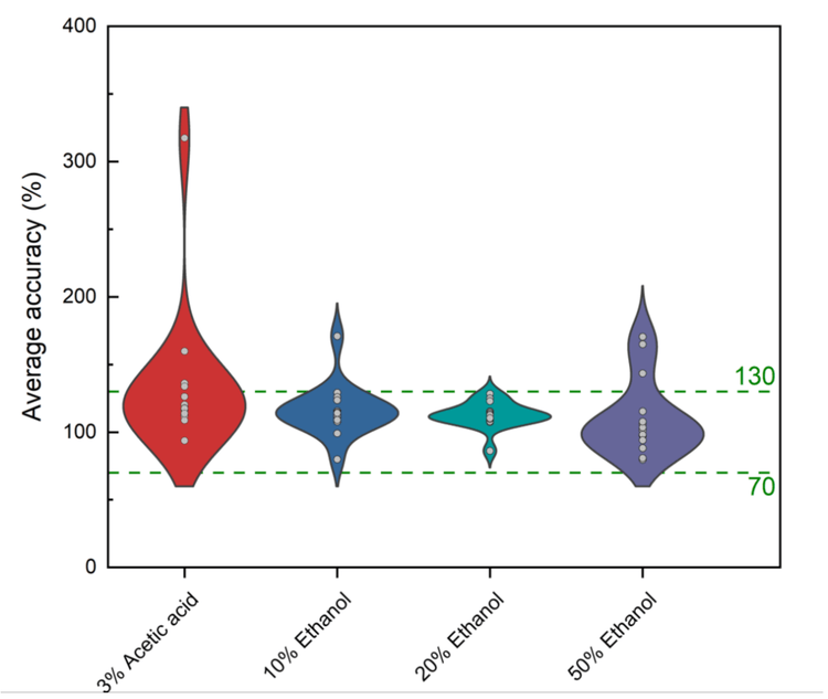 Overall, the 10 ng/mL post-extraction spikes of the representative plastic food material (for example, yogurt container) showed good accuracy among the 4 food simulants, indicating minimal quantitative bias due to the matrix (Figure 3). The individual data points in Figure 3 represent the average of 6 replicates per Irganox compound. The 10% and 20% ethanol food simulants showed 70-130% accuracy for all compounds except for Irganox 1010 in the 10% ethanol simulant. The 50% ethanol and 3% acetic acid extracts showed 3 and 4 Irganox compounds outside the 70-130% acceptable range, respectively. No Irganox compounds were detected in the yogurt container, prior to spiking.