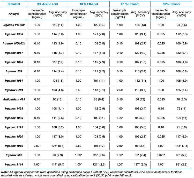 It is recommended to analyze the Irganox compounds with accuracies that failed to meet the 70-130% accuracy criteria using matrix-matched calibration or with mass-labeled internal standards. Overall, these findings demonstrate that the majority of the Irganox compounds in the 4 food simulants can be accurately quantified without the need for internal standards.