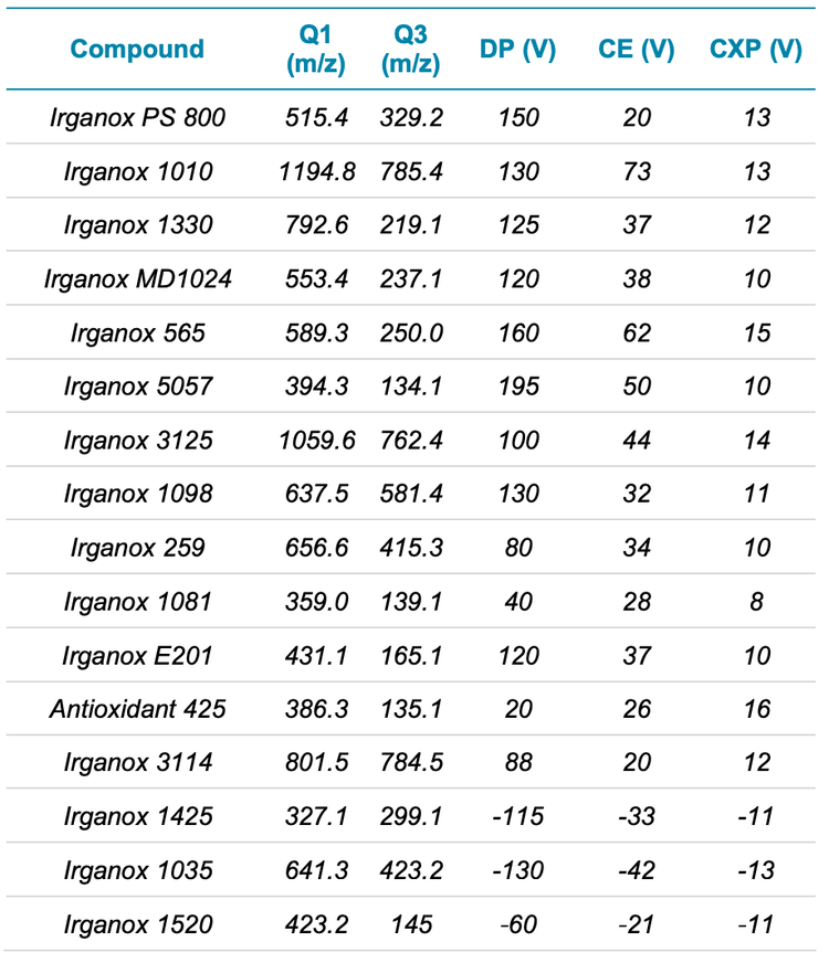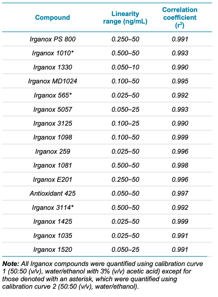 Calibration curve preparation: Stock solutions were prepared in methanol and spiked into calibration solution 1 or 2, depending on compound-specific solubility. Calibration solutions were composed of 50:50 (v/v), water/ethanol with 3% acetic acid by volume (calibration curve 1) and 50:50 (v/v), water/ethanol (calibration curve 2). Thirteen of the 16 Irganox compounds were prepared as described for calibration curve 1. The final calibration curves ranged from 0.025 to 50 ng/mL.