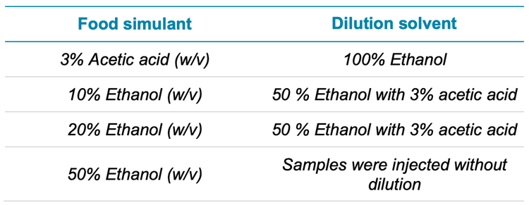 - Two external calibration curve preparations that were dependent on compound-specific solubility were used to analyze food packaging samples in 4 different food simulants, based on EU regulations