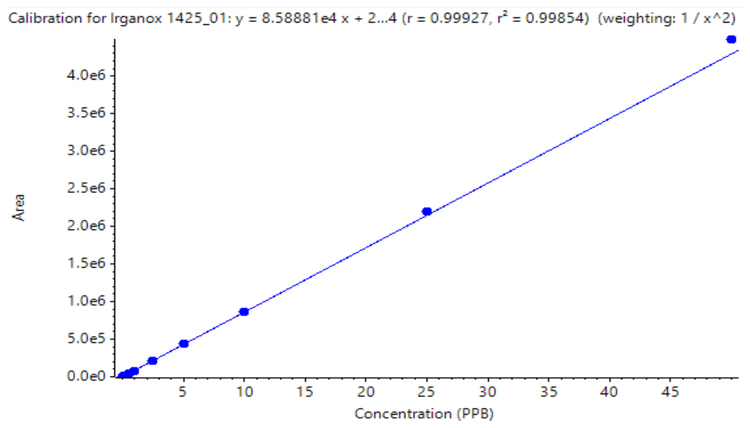 Calibration curves were generated for all compounds analyzed across a concentration range of 0.025 to 50 ng/mL. Standards were prepared in the calibration 1 diluent (50:50 (v/v), water/ ethanol with 3% acetic acid by volume), unless specified. Table 5 shows the accurate quantification achieved across this range with an r2 value >0.99. The lower limit of quantification (LLOQ) is represented by the lowest standard analyzed in the calibration range and this value varied from 0.025 to 0.5 ng/mL across Irganox compounds. Figure 2 shows an example calibration curve using the quantifier transition for Irganox 1425, which demonstrates the linear dynamic range of 0.025 to 50 ng/mL and r 2>0.99.