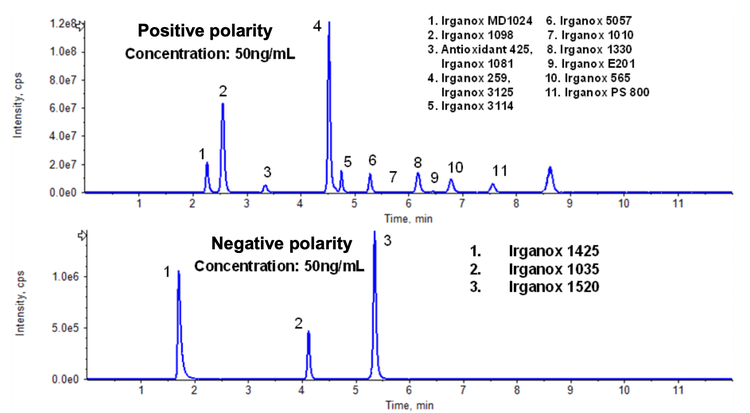 - A fast polarity switching method was developed to analyze 16 Irganox compounds in a single method