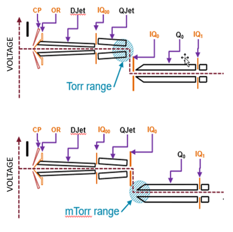 Additional declustering of ions can be achieved on the SCIEX 7500 system by using a voltage differential applied either between the QJet ion guide and IQ0 lens (Q0 dissociation, Q0D simple) or between the IQ0 lens and Q0 rods (Q0D enhanced), illustrated in Figure 2. Q0D is useful for breaking up clusters, decreasing interferences and increasing signal to noise in some cases. Q0D was optimized for a subset of the analytes that were the most difficult to detect in green tea and spices. MRM extracted ion chromatograms (XICs) for milbemectin A3 in spices that were acquired using both default settings and optimized Q0D enhanced settings are shown in Figure 3. In this case, a signal to noise increase of 3.5-fold was observed after optimization of Q0D.