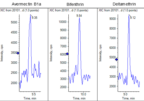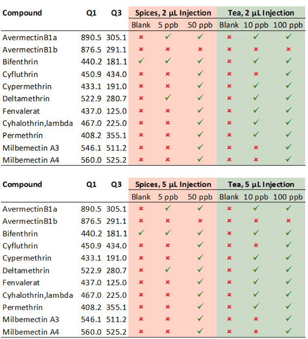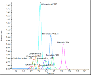 - Highly sensitive detection and quantification of avermectin (containing 96% avermectin B1a and 4% avermectin B1b), bifenthrin, cyfluthrin, cypermethrin, deltamethrin, fenvalerat, λ-cyhalothrin, milbemectin A3 and A4 and permethrin from QuEChERS extracts of spices and green tea
