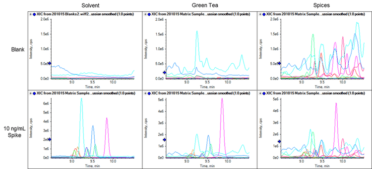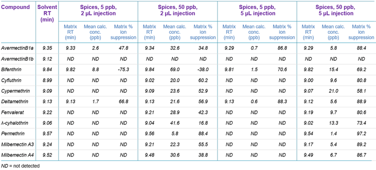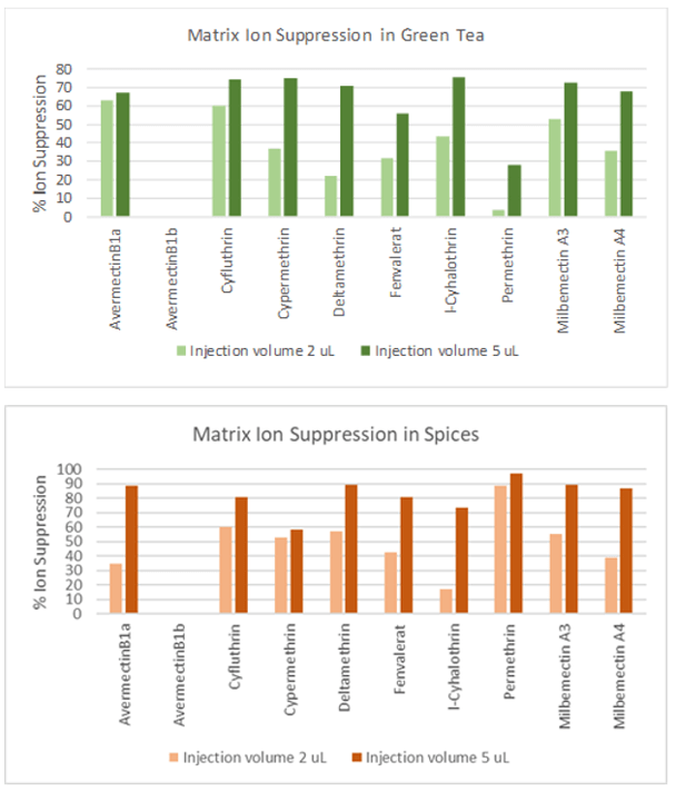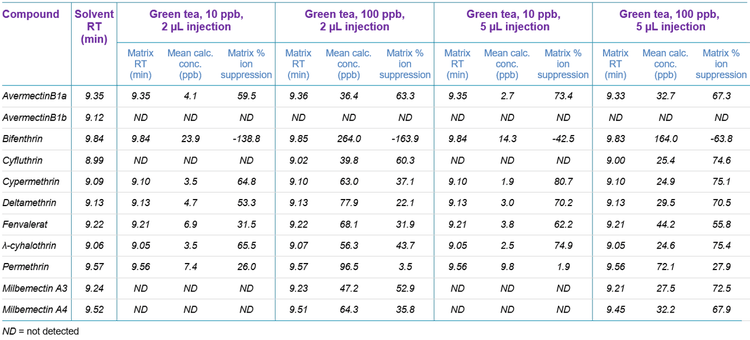 Compounds were next spiked into QuEChERS extracts of spices and green tea at 1 ng/mL and 10 ng/mL, corresponding to 5 ppb and 50 ppb in spices and 10 ppb and 100 ppb in tea. Quantification of target compounds in matrix against the dilution series in solvent was performed using both 2 µL and 5 µL injection volumes to assess the effect of lowering the injection volume on matrix ion suppression. It was found that the reduction in ion suppression observed for a 2 µL injection compared with a 5 µL injection mostly compensated for the reduction in injection volume to the extent that the sensitivity of the assay was not significantly impacted (Table 2 and Figure 6). Figure 7 demonstrates the background signal and ion suppression observed with a 2 µL injection volume; however, the level of ion suppression was much less than the ion suppression observed with higher volume injections (Figure 6).