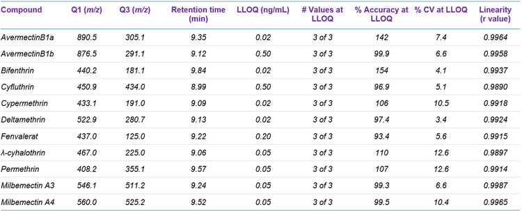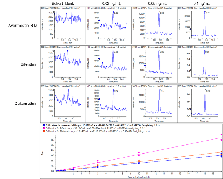 Sample preparation: Avermectin (containing 96% avermectin B1a and 4% avermectin B1b), bifenthrin, cyfluthrin, cypermethrin, deltamethrin, fenvalerat, λ-cyhalothrin, milbemectin A3 and A4 and permethrin were diluted into mobile phase A for analysis. Calibration curves were constructed in mobile phase A by spiking in compounds at concentrations of 0.02–20 ng/mL.