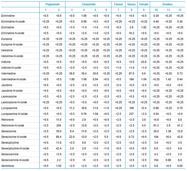 Pyrrolizidine alkaloids (PAs) are a large group of natural secondary metabolites with alkaloid structures that are produced by plants as a defense against herbivores. They have been detected in significant concentrations in plant-based food, such as herbal infusions, black or green tea, green leafy vegetables, and honey products. Within the last ten years, more and more attention has been drawn to the presence of PAs in food, since various studies have demonstrated their hepatotoxicity as well as their genotoxic and carcinogenic potential. For these reasons, the European Food Safety Authority concluded that PAs represent a serious health concern and ranked them among the substances in food requiring careful monitoring.1 Still, no legal limits for maximum allowed concentrations of PAs in food are available yet. As a result, the generally accepted maxim these days is to keep PAs concentrations in food as low as reasonably achievable.2