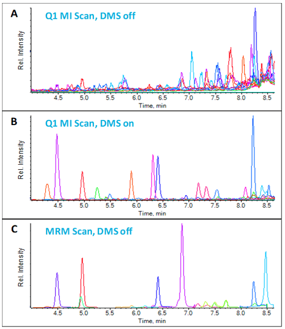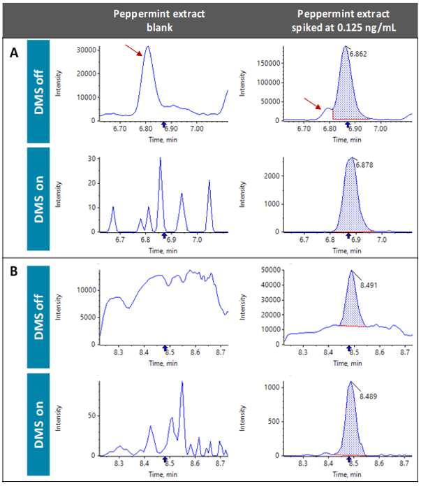 Next, the selectivity of using DMS with a Q1 Multiple Ion was compared to the industry standard MRM approach (Figure 6) using a peppermint extract. DMS provided an increase in the selectivity of the Q1 MI scan compared to a Q1 MI scan without DMS and similar selectivity to the classical MRM experiment. For this reason, it is considered sufficient to monitor one single MRM transition for each PA compound when working with the ion mobility device, which allows to increase dwell times and thus to improve signal-to-noise at lower concentrations.