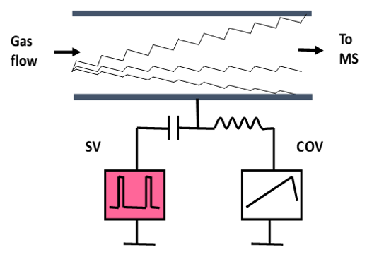 Figure 3 shows the principle of the separation in the ion mobility device. The DMS cell is composed of two flat plates that are parallel and define a mobility region. While the ions are drawn by the transport gas flow towards the MS, the power supply outputs two sine waves of different frequencies on each of the two DMS electrodes, resulting in an oscillating high and low voltage field (separation voltage, SV). Due to the difference between high and low field ion mobility coefficients, ions will migrate toward the walls on a wavelike path and leave the flight path unless their trajectory is corrected by a counterbalancing voltage, a DC potential referred to as compensation voltage, COV. This compensation voltage is highly specific for each compound and enables the removal of matrix interferences and the separation of isomers.