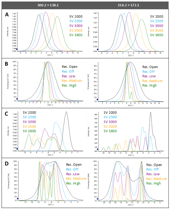 For both the non-oxidized and oxidized compounds, a slight broadening of the peak was observed when the COV was ramped at increasing separation voltages (Figure 4A), indicating a beginning, very slight separation of the isomers. In the next step, the resolution gas was adjusted, which increases the residence time of the ions in the cell and thereby the resolution of the separation. With the resolution gas flow set to high, shoulders are detected on the signals for both analyte groups, but still the four isomers are far from being separated (Figure 4B).