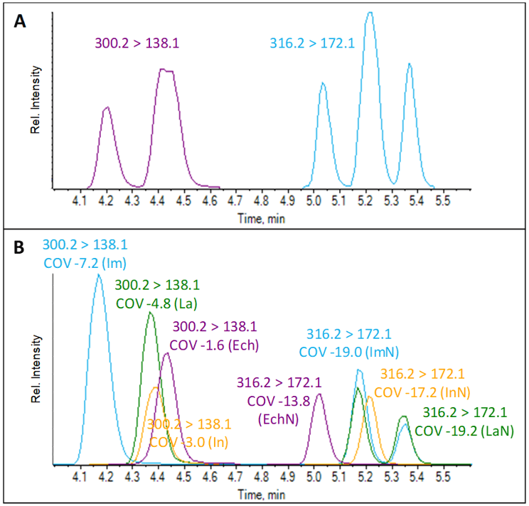 Figure 4 shows the tuning results for a standard mixture of intermedine, indicine, lycopsamine, and echinatine, and their oxidized species. These analytes are especially demanding in LC-MS analysis, since they are difficult to separate by chromatography and, moreover, they have the same transitions in MS analysis.