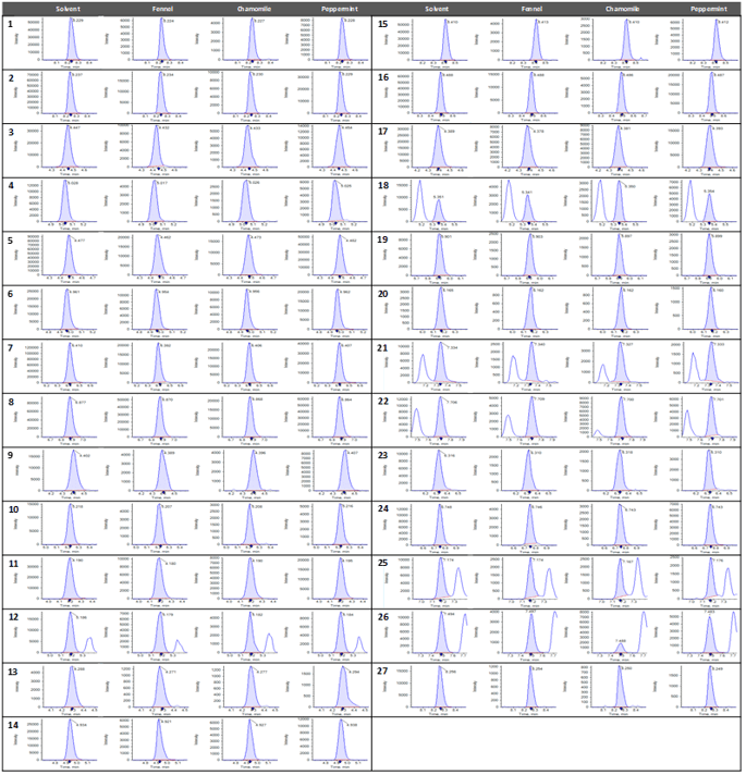 With the final method using SelexION+ Technology, blank extracts from fennel, chamomile, and peppermint spiked with pyrrolizidine alkaloids to final concentrations from 0.125-25 ng/mL (corresponding to 0.25-50 ng/g raw material) were analyzed. Depending on the compound and matrix, the lowest detectable concentration was between 0.125 ng/mL and 1.25 ng/mL. Figure 8 shows the chromatograms at 2.5 ng/mL.