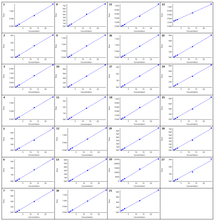All compounds behaved linearly in the concentration range from 0.25-25 ng/mL with coefficients of correlation greater than 0.99 (Figure 9). Higher concentrations were not tested, but it can be expected that the concentration range could be extended due to the excellent dynamic range of the SCIEX QTRAP 6500+LC-MS/MS system.