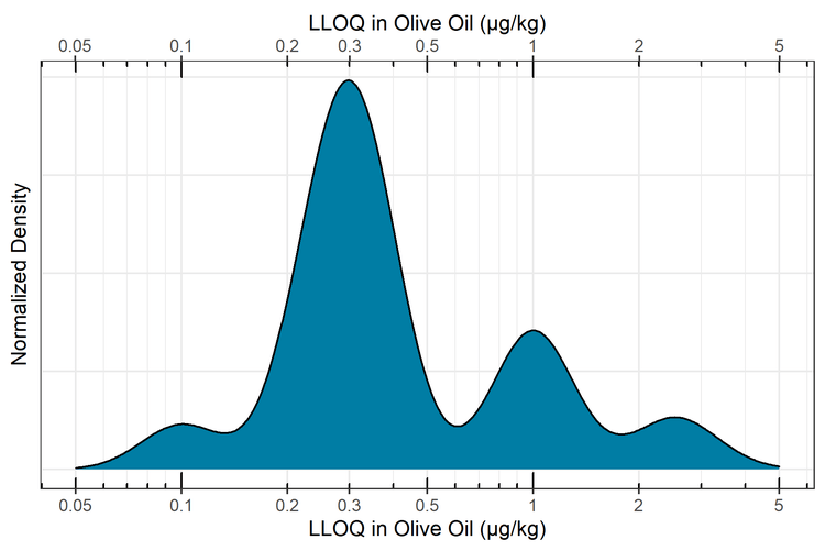 To assess the in-matrix quantitative performance of the ZenoTOF 7600 system, n=6 replicates of a matrix matched curve was constructed in QuEChERS extracted olive oil ranging from 0.10 µg/kg to 0.10 mg/kg. Incorporating the 5x dilution during sample preparation, in-vial concentrations ranged from 0.02 to 20 ng/mL. The curve was assessed for linearity, accuracy and precision, mass accuracy and ion ratios according to SANTE/12862/2019 guidelines. Figure 5 shows the distribution of in-matrix LLOQs determined for the quantified pesticides. It can be observed that nearly all quantified pesticides have an LLOQ below 0.001 mg/kg, with the majority with LLOQs falling between 0.0002 and 0.0005 mg/kg. Also, all quantified pesticides showed LLOQs at or below 0.005 mg/kg, meaning that the ZenoTOF 7600 system has enough sensitivity to meet nearly any global pesticide residue regulation, as most maximum residue limits are set as low as 0.010 mg/kg. Additionally, the use of accurate mass fragment ions for quantification cuts through nearly all noise and interferences, simplifying peak detection and integration to eliminate the need for manual peak review.