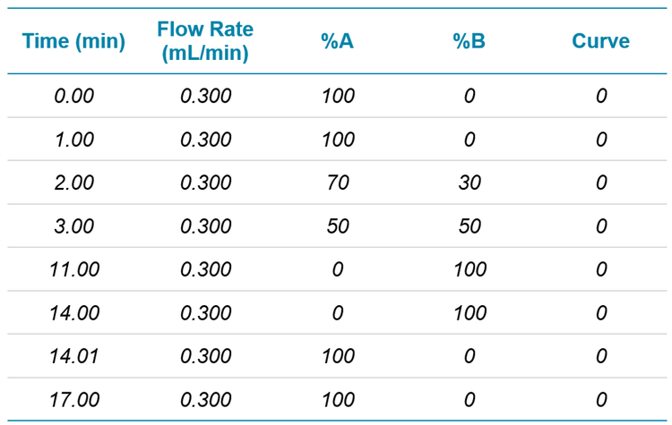Chromatography: Analytes were separated on a polar-embedded reverse phase C8 column (2.1 x 150 mm, 1.8 µm) using a SCIEX ExionLC AD system. Separation was performed at a flow rate of 300 µL/min with a column temperature of 35ºC and an autosampler sample storage temperature of 5ºC. Mobile phase solvents were (A) 98:2 water/methanol and (B) 2:98 water/methanol, both with 0.1% formic acid and 5 mM ammonium formate. The gradient program can be seen in Table 1. Total runtime was 17 minutes.