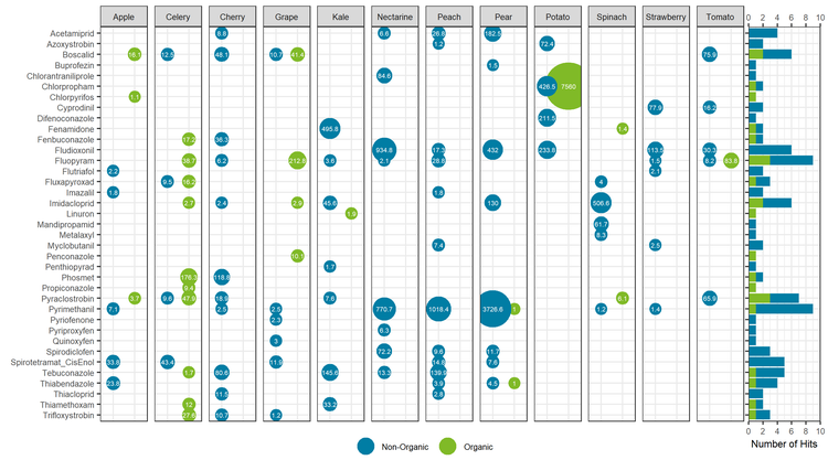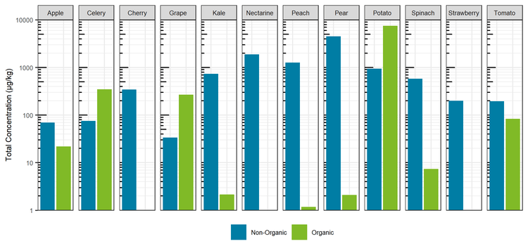 Comparing the sum total of pesticides detected for each specific food, traditionally farmed produce showed a larger total pesticide burden, with the exception of celery, grapes and potatoes. For these exceptions, the organic produce showed a larger total pesticide concentration (Figure 7). For the non-organic produce, pears, peaches and nectarines showed the largest total concentration, whereas potatoes showed the largest sum concentration for the organic produce and for produce overall. Sum total concentrations ranged from less than 0.001 mg/kg to greater than 7 mg/kg. Comparing the aggregate concentration distribution for each pesticide hit between all organic and non-organic produce, the organic produce showed a slightly lower average concentration, as seen in Figure 8.