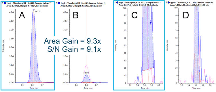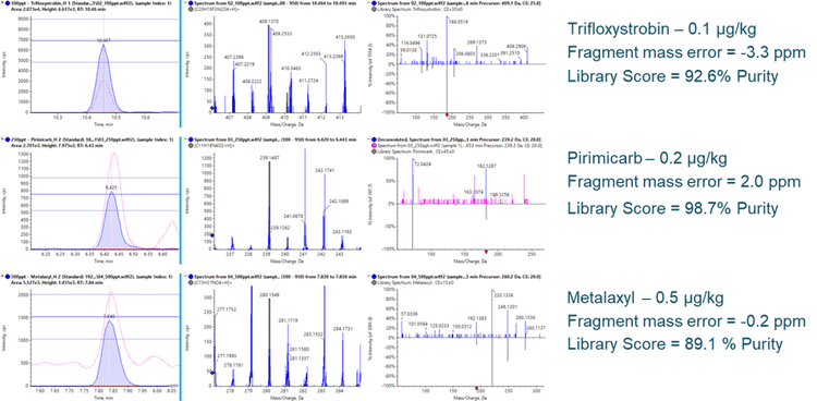 At the calculated LLOQs, the quality of qualitative information acquired remains consistent. Figure 6 highlights three example pesticides at their respective LLOQs. In each case, the fragment XICs (left, filled blue traces) show ample S/N for detection and improved S/N over the precursor XICs (pink traces). The ion ratio thresholds, adopted from the SANTE nominal mass requirement of ± 30%, are maintained at these low concentrations. With the additional sensitivity, mass error on fragments can also be maintained due to the improved ion statistics during detection, as well as the generation of clear and unambiguous MS/MS spectra for library confirmations, even in dirty matrices.