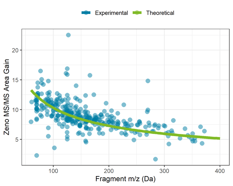 The use of the Zeno trap on the ZenoTOF 7600 system allows for >90% of duty cycle related losses to be recovered during MS/MS experiments across the entire mass range. With traditional orthogonal injection QTOF mass spectrometers, ion losses occur as a result of mating a continuous ion beam coming from the quadrupole ion guides with the pulsed nature of the TOF accelerator. To overcome this on the ZenoTOF 7600 system, a Zeno trap was added at the end of the Q2 collision cell assembly, where an ordered release of ions based on their potential energy allows for all ions to arrive at the TOF accelerator at the same time and location. For this reason, the sensitivity enhancements are both dependent on the upper limit of the MS/MS scan range and the mass of the fragment ion. Figure 1 shows the experimental gains experienced during this analysis overlaid with the theoretical gains based on the fragment masses and scan parameters used in this experiment. Here we can see that enabling the Zeno trap yields a minimum of 5x intensity gain, with gains up to 13x as fragment masses decrease.