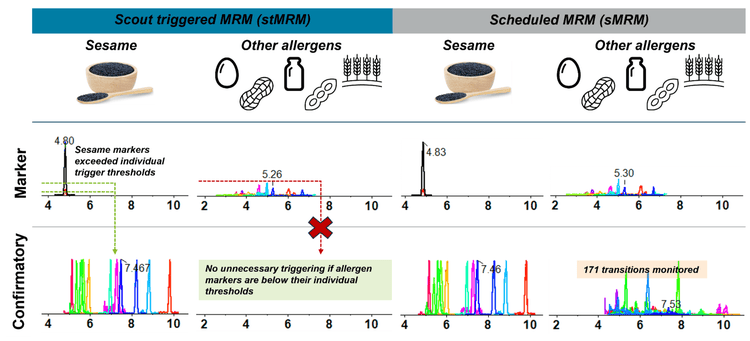 Leveraging this intelligent triggering algorithm, an stMRM method comprised of marker and confirmatory peptides was developed and compared against sMRM for the screening of 16 allergens in different food samples.