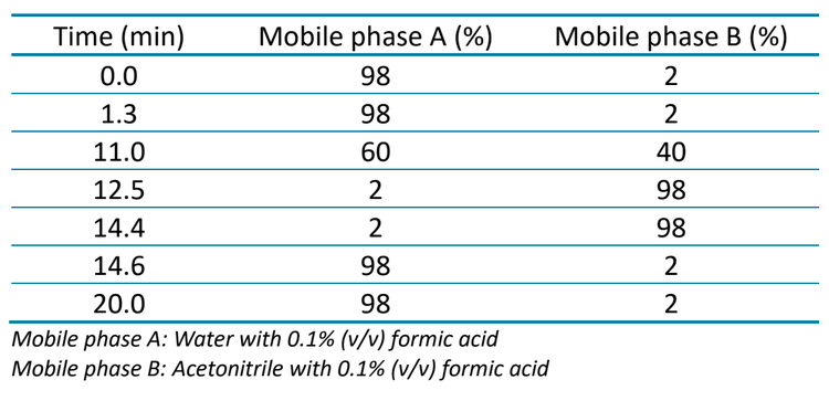 Chromatography: Chromatographic separation was performed on a Shimadzu Nexera Prominence LC system using a Kinetex C18 as the analytical column (100 x 3.0 mm, 2.6 µm, Phenomenex P/N 00D-4462-Y0). A flow rate of 0.3 mL/min, an injection volume of 2 µL and a column temperature of 30oC were used. The LC gradient used is shown in Table 1.