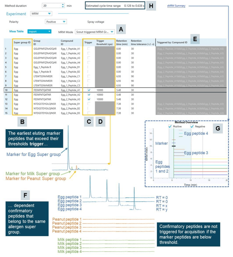 The earliest eluting peptide within each allergen super group is designated as the marker by the Trigger column with their corresponding MRM transitions also identified in the Triggered by: Compound ID column. When the marker transitions exceed their user-specified trigger thresholds, data acquisition turns on for the entire allergen super group, which includes the later-eluting confirmatory peptide transitions. As shown in Figure 2F, only the egg marker peptide exceeded its trigger threshold, which triggered all of the egg allergen confirmatory peptides, while the peanut and milk super groups were not acquired. This ensures that cycle time is preserved and not spent on unnecessary data collection when the allergen peptides are not present at relevant levels.