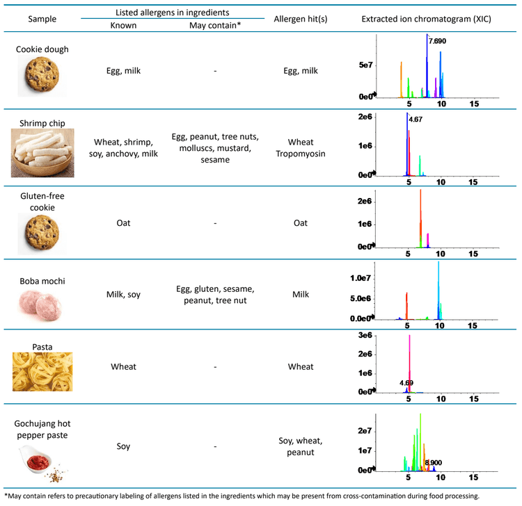 Food samples with specific allergens listed in the ingredients were selected for screening using stMRM. Table 4 lists the positive hits, all of which match at least one of the allergens specified in the ingredients claim on the food product label. In addition, stMRM did not acquire data for the allergens that are not listed nor expected to be present in the food sample. The expansion of the analyte panel also identified several new allergens that were not previously included in the SCIEX vMethod. For example, a shrimp chip extract exhibited positive hits for the peptides specific to wheat and tropomyosin, the latter being a known allergen for shellfish. Another interesting sample was the gochujang hot pepper paste, a common ingredient in Korean cuisine, that is made from fermented soybeans. In addition to soy, stMRM also detected the peptides for the wheat and peanut allergens, both of which were not listed on the product label. This demonstrates the effectiveness of stMRM for allergen detection in commercial food samples