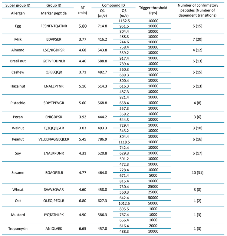 Table 3 lists the earliest eluting marker peptides of each allergen group, their RTs, MRM transitions, trigger thresholds and the number of their corresponding dependent transitions from the confirmatory peptides. Dynamic background subtraction (DBS) prioritizes triggering marker transitions that change in intensity above a user-specified threshold during the elution of a chromatographic peak. This option was enabled to set more consistent trigger thresholds despite changing analyte concentrations and matrices.
