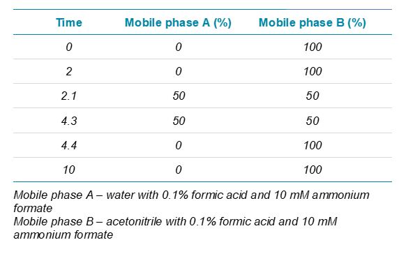 Chromatography: The target compounds were separated using a normal phase gradient on a hydrophilic interaction chromatography (HILIC) column. LC separation was achieved using a high-flow LC system with a Phenomenex Luna HILIC 3µm (100 x 2 mm) column at a flow rate of 0.2 mL/min (Table 1). A sample volume of 10 μL was injected.